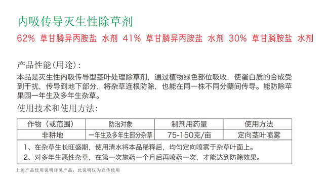 30%草甘膦銨鹽AS, 30%草甘膦異丙胺鹽AS, 38%2甲·草甘膦AS, 46%草甘膦異丙胺鹽AS, 68%草甘膦銨鹽SG,80%草甘膦銨鹽SG ,80%乙羧·草甘膦WP